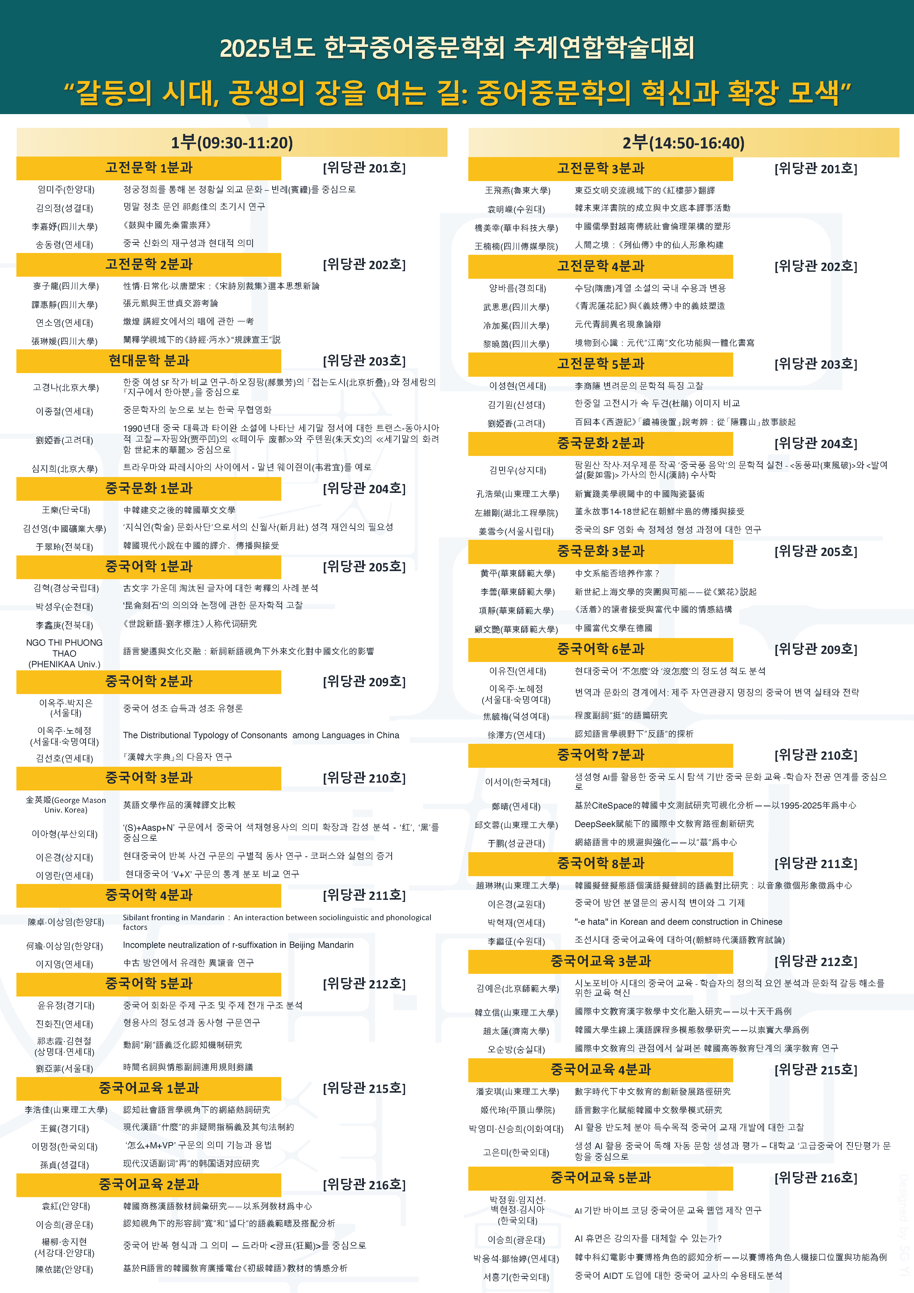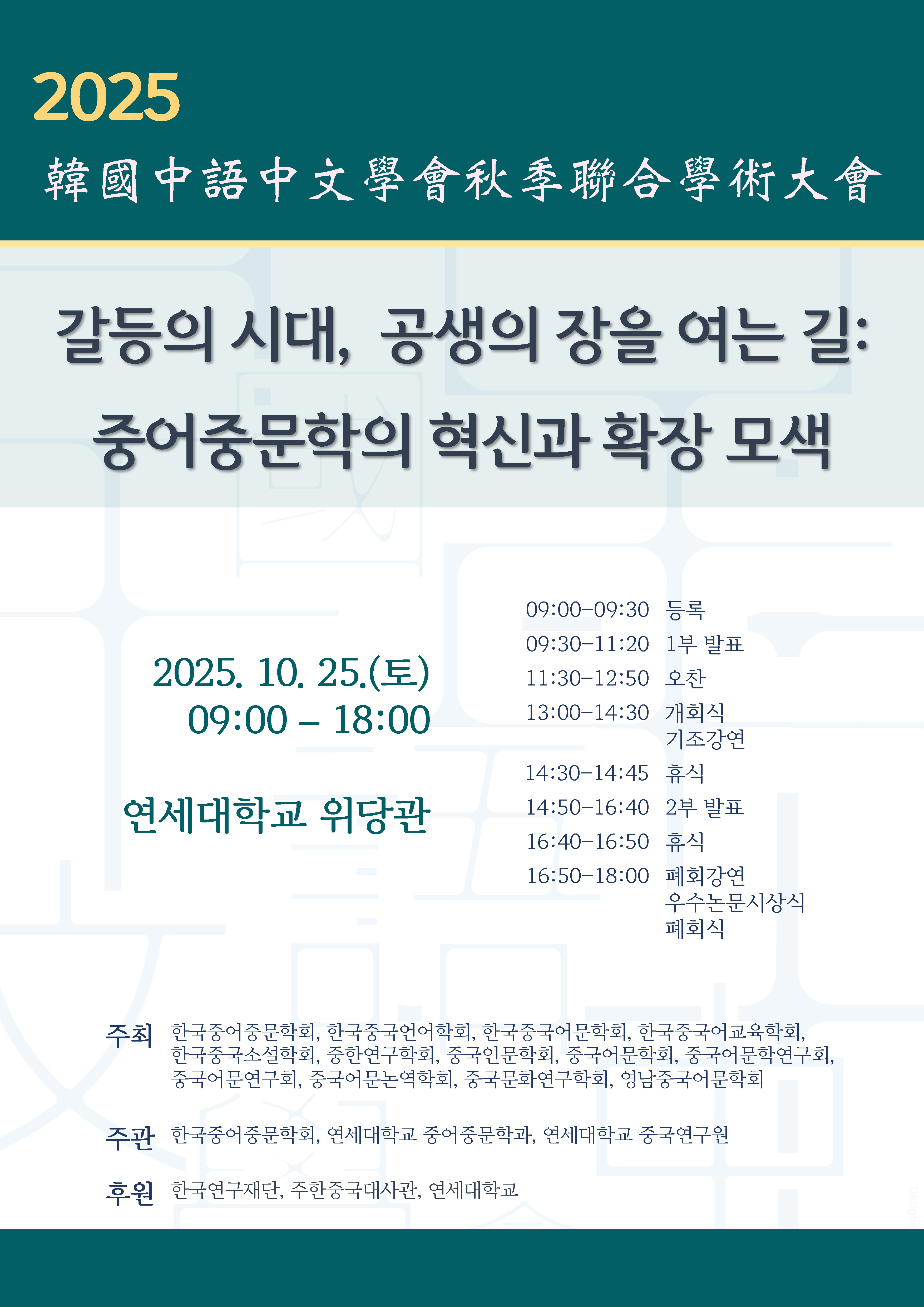 - 주제 : “갈등의 시대, 공생의 장을 여는 길: 중어중문학의 혁신과 확장 모색” - 일시 : 2025년 10월 25일(토) - 장소 : 연세대학교(서울 신촌) 주최 : 한국중어중문학회, 한국중국언어학회, 한국중국어문학회, 한국중국어교육학회, 한국중국소설학회, 중한연구학회, 중국인문학회, 중국어문학회, 중국어문학연구회, 중국어문연구회, 중국어문논역학회, 중국문화연구학회, 영남중국어문학회 주관 : 한국중어중문학회, 연세대학교 중어중문학과, 연세대학교 중국연구원 후원: 한국연구재단, 주한중국대사관, 연세대학교 참석 등록 링크 https://docs.google.com/forms/d/e/1FAIpQLSdwL8qEg-8EnKjPBdyCPog8S4a5JWex1Jw_Vk61iNkKwRuWlw/viewform?usp=sharing&ouid=100047433079843758728 (i.미리 등록해 주시면 학회 준비에 큰 도움이 됩니다.) (ii. 이미 등록하신 분들은 재등록하지 않으셔도 됩니다.)